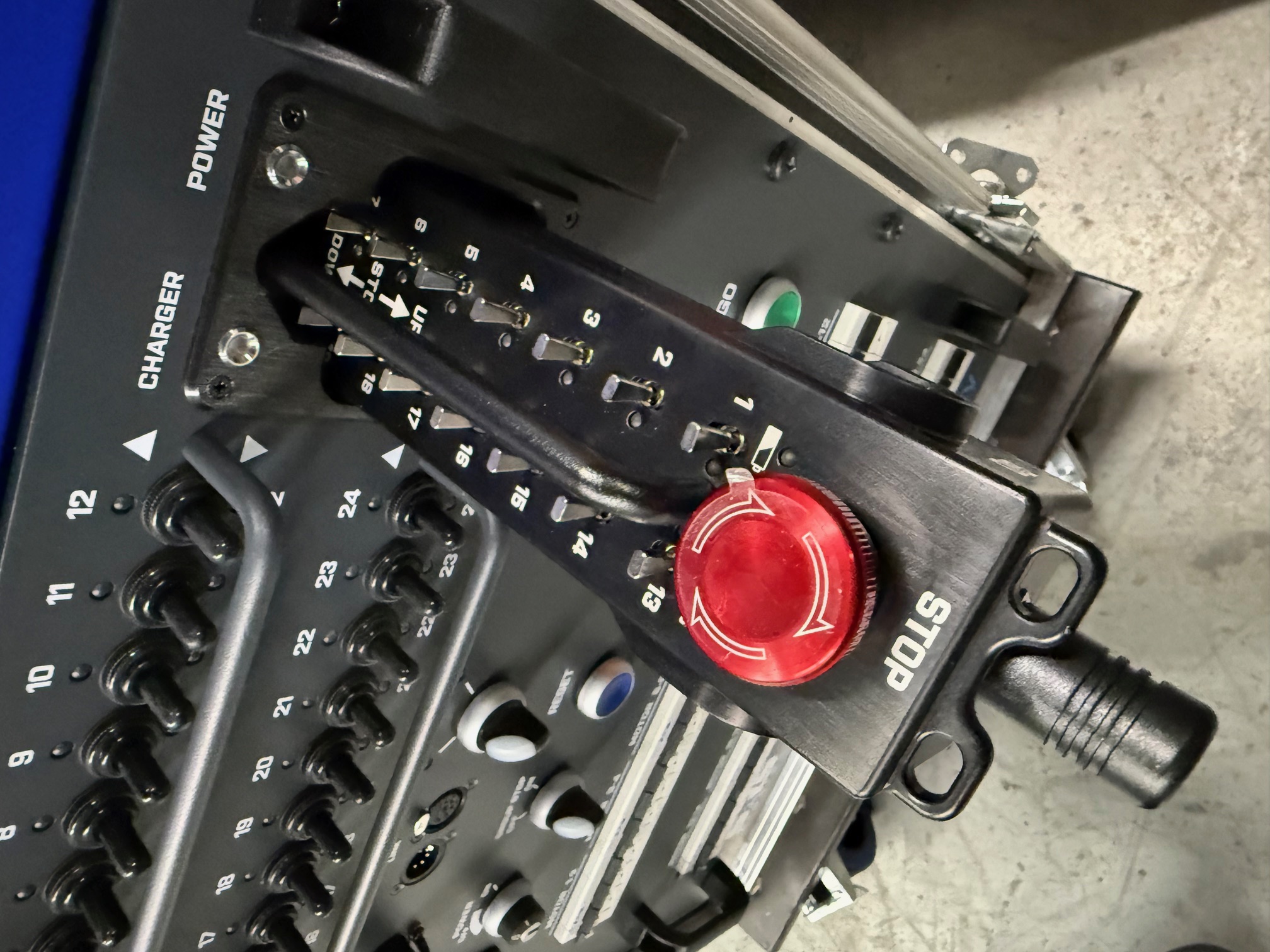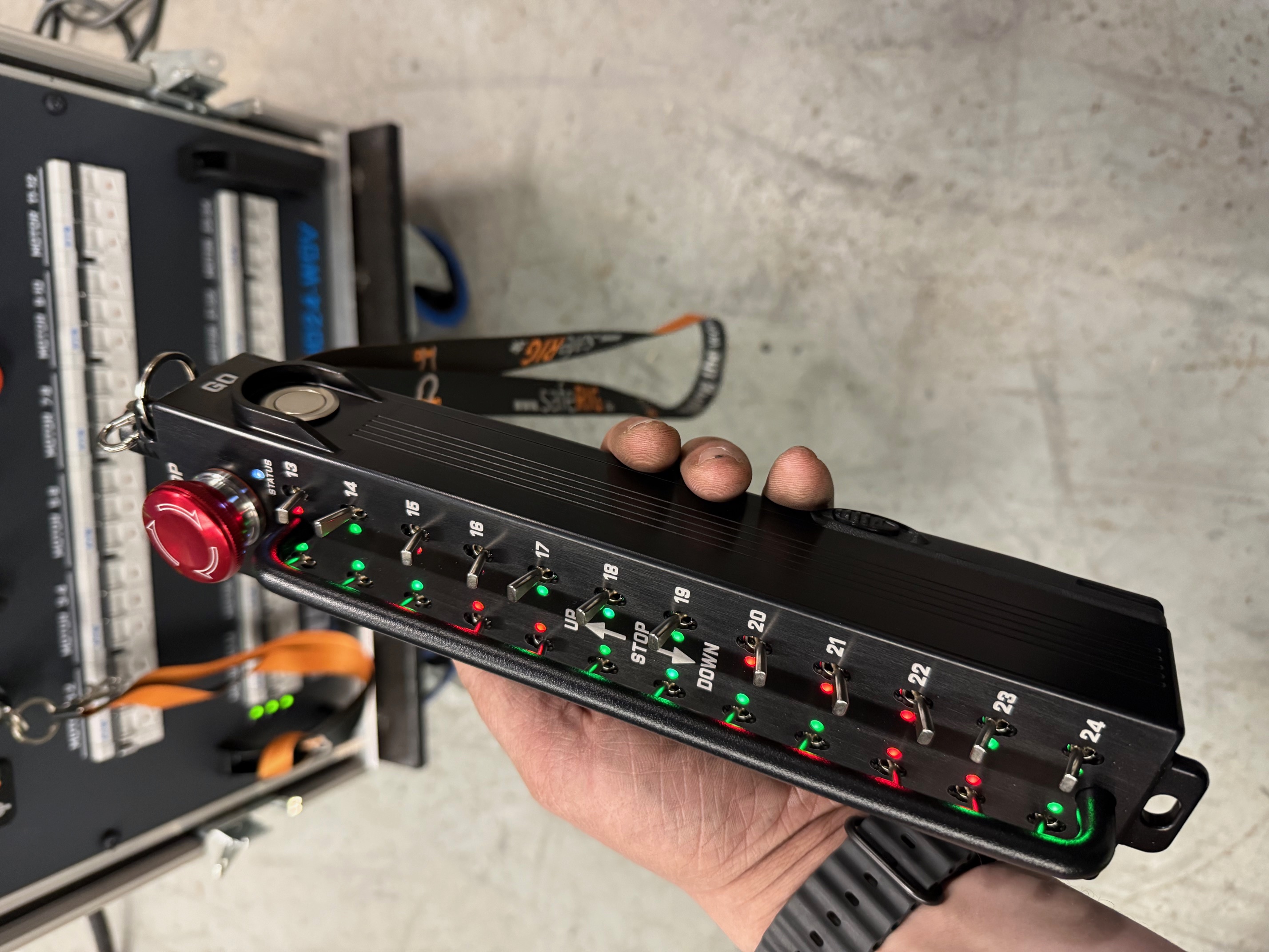 24 geschützte Kippschalter dienen zur direkten Auswahl der Hubrichtung am Gerät. Eine LED Statusanzeige je Kippschalter zeigt die gewählte Hubrichtung eindeutig an.